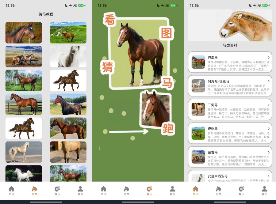 【软件版本】:2.1 【软件大小】:100MB 【适用平台】:安卓 【软件介绍】:提供丰富的马类百科知识与马术教程, 助您了解不同马种与骑术 技巧。内置“看图猜马”趣味游戏,在轻松互动中巩固认知,适合 马术爱好者与初学者拓展视野。
